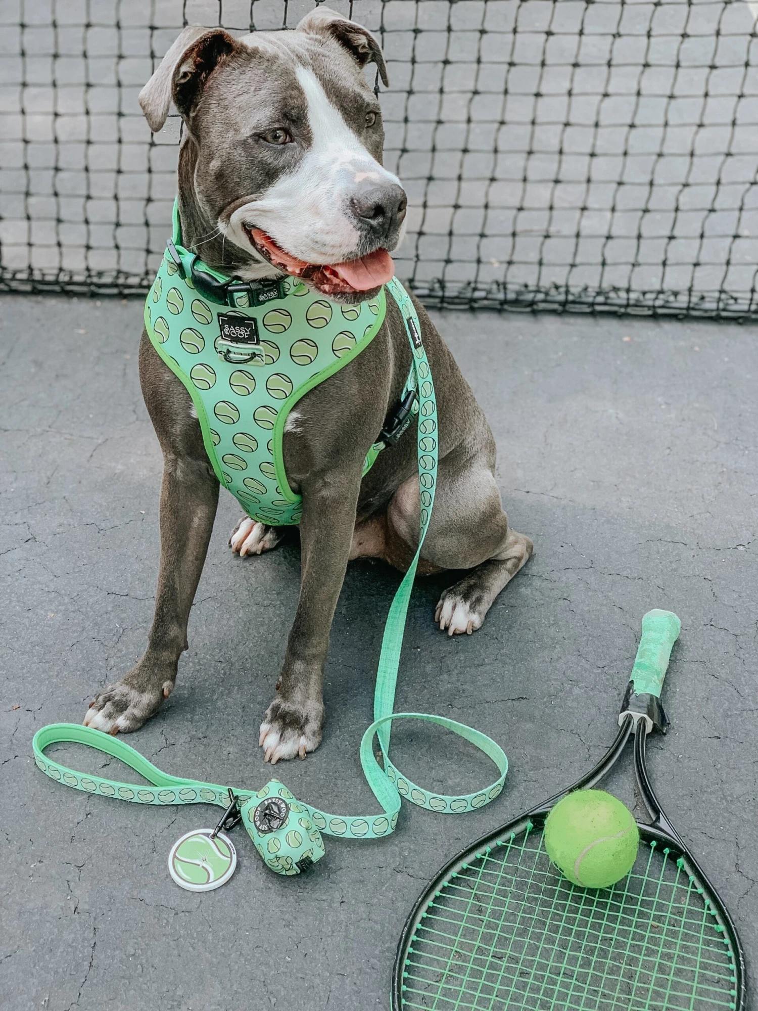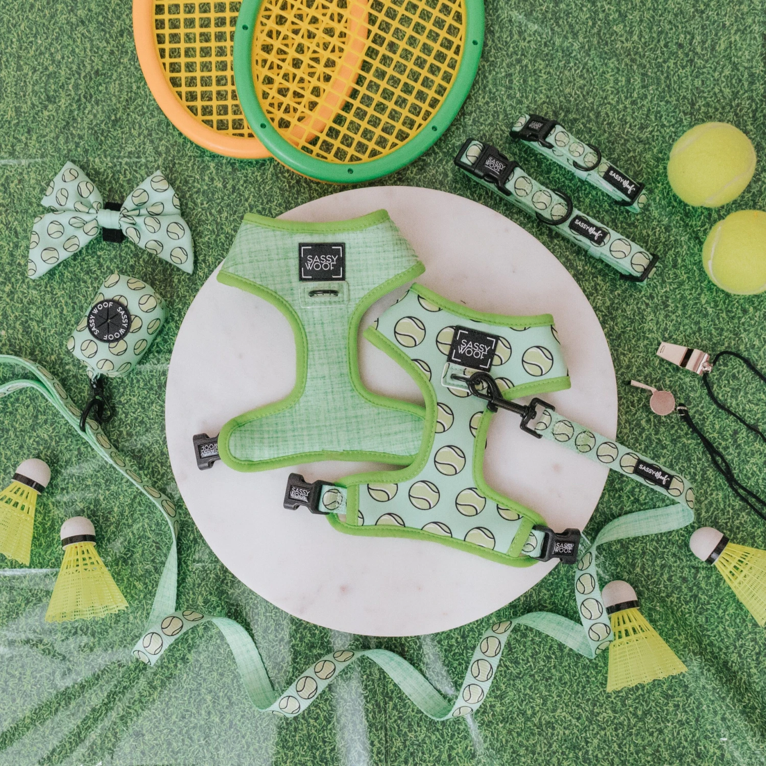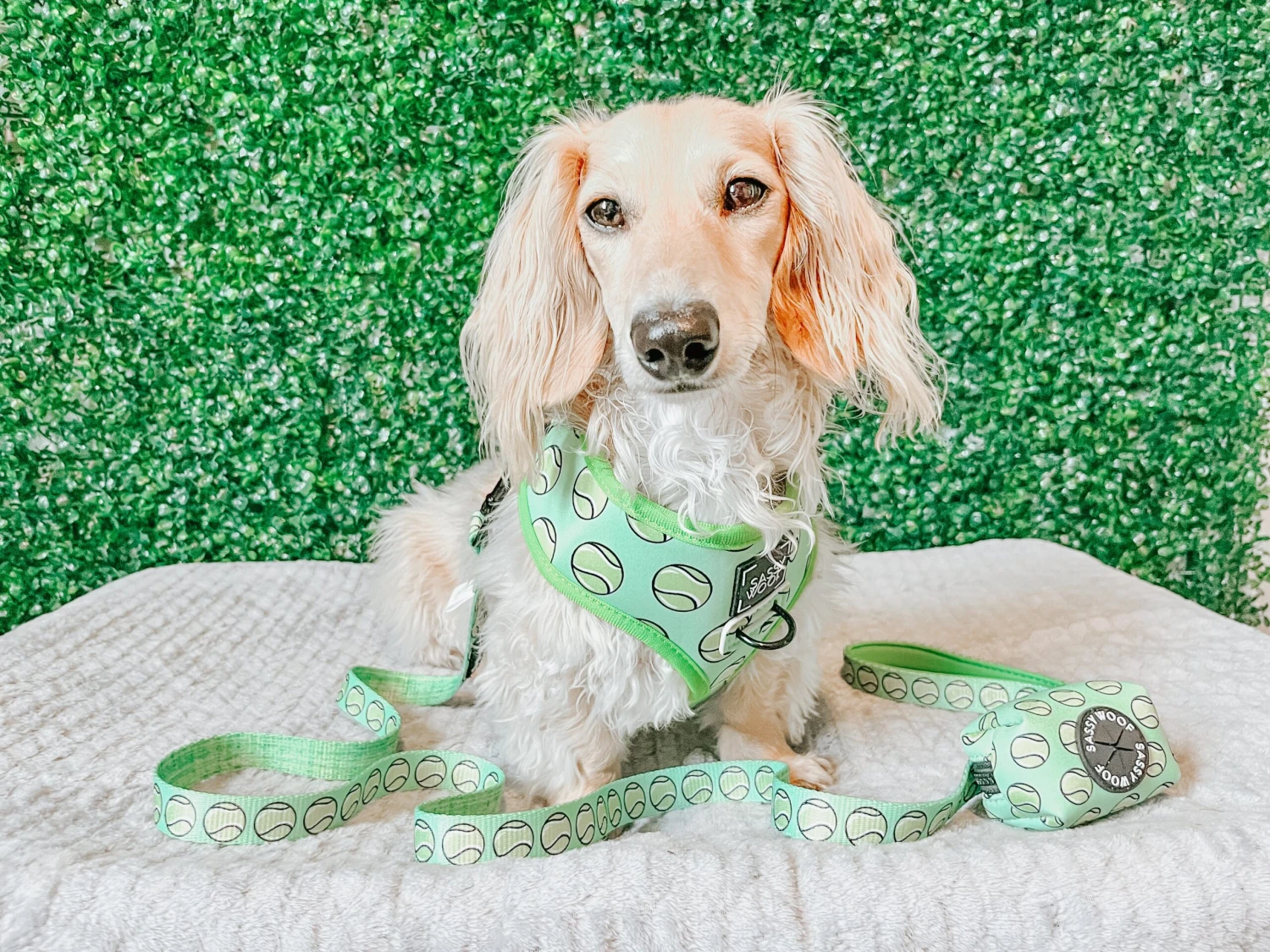 Fetch me if you can! Your pup will be fast as a speedy tennis ball in this gorgeous bright green reversible harness with tennis balls bundle!