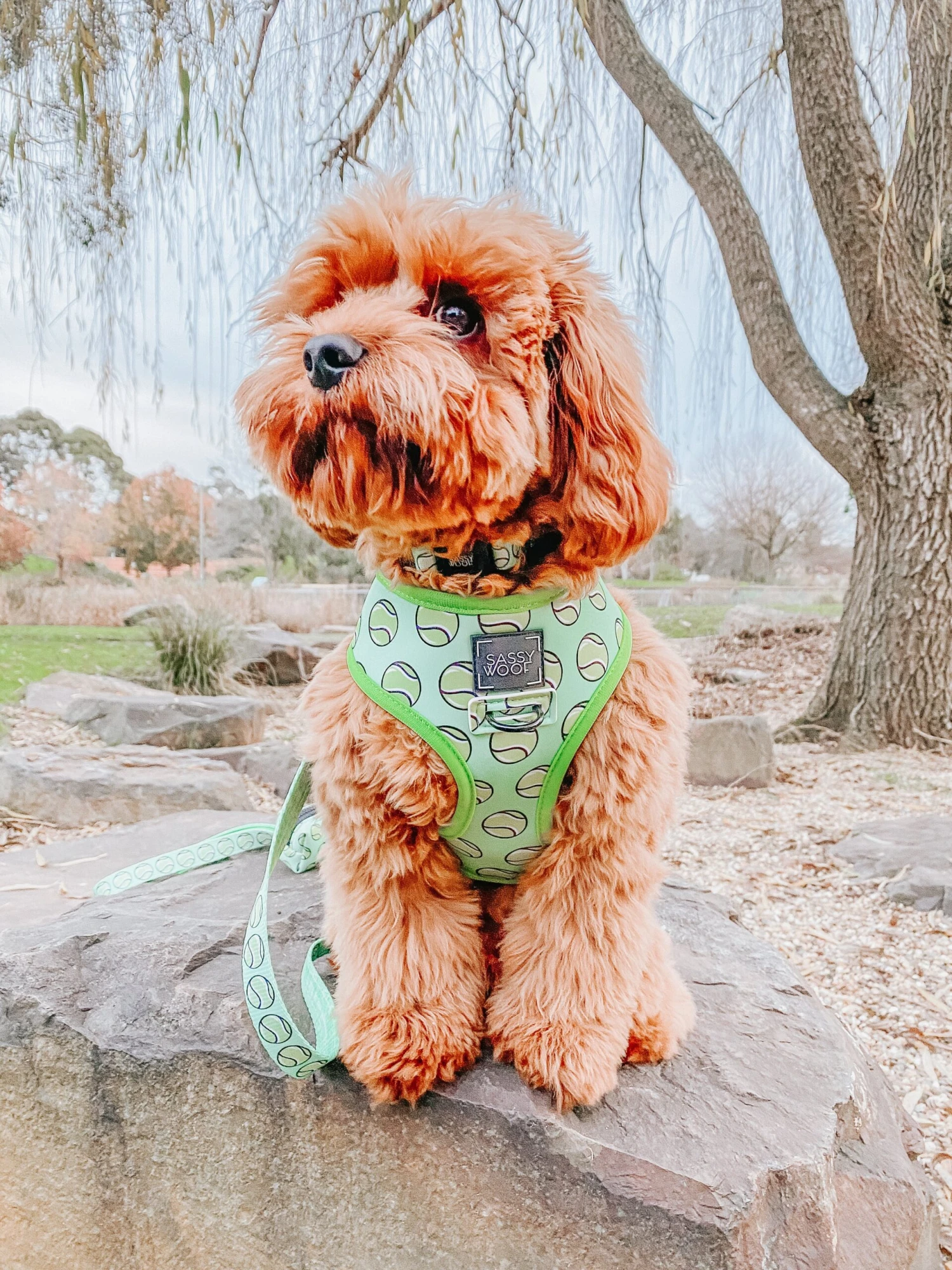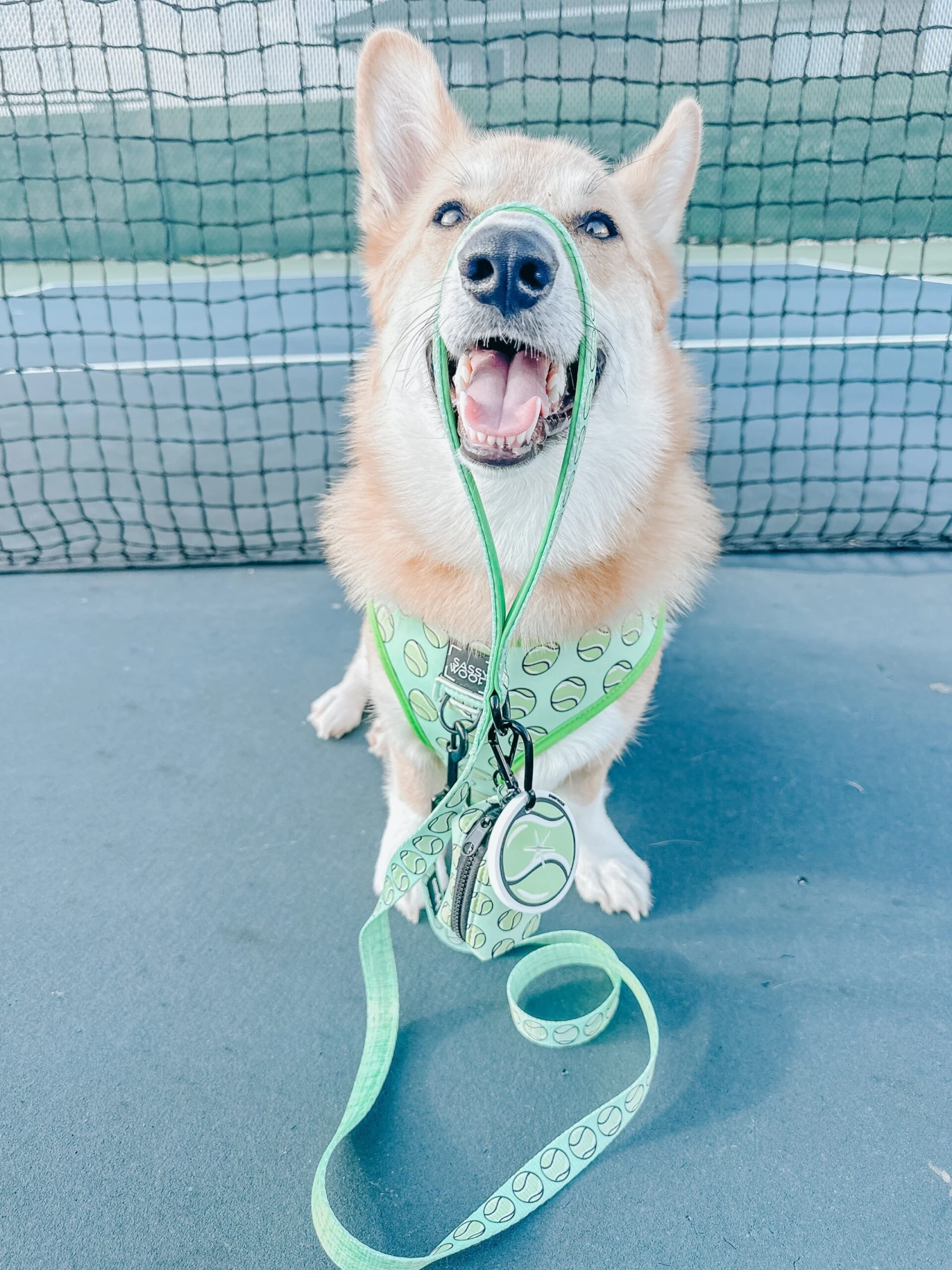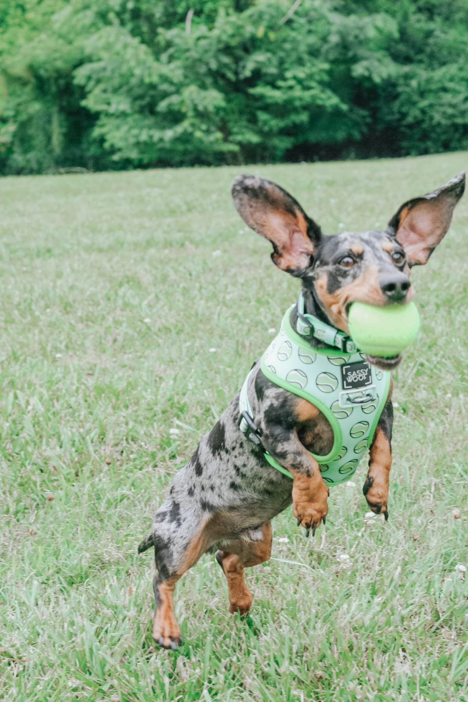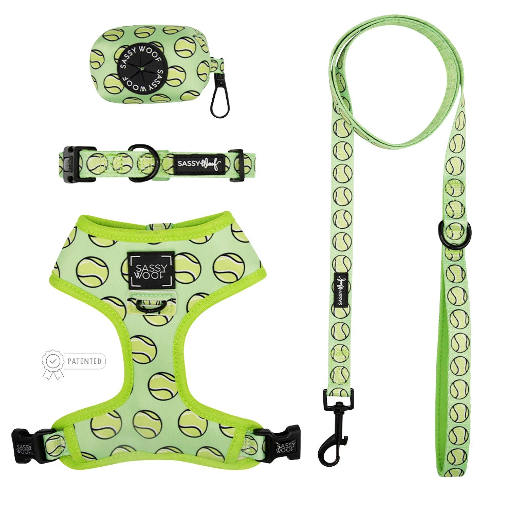 Fetch me if you can! Your pup will be fast as a speedy tennis ball in this gorgeous bright green reversible harness with tennis balls bundle!