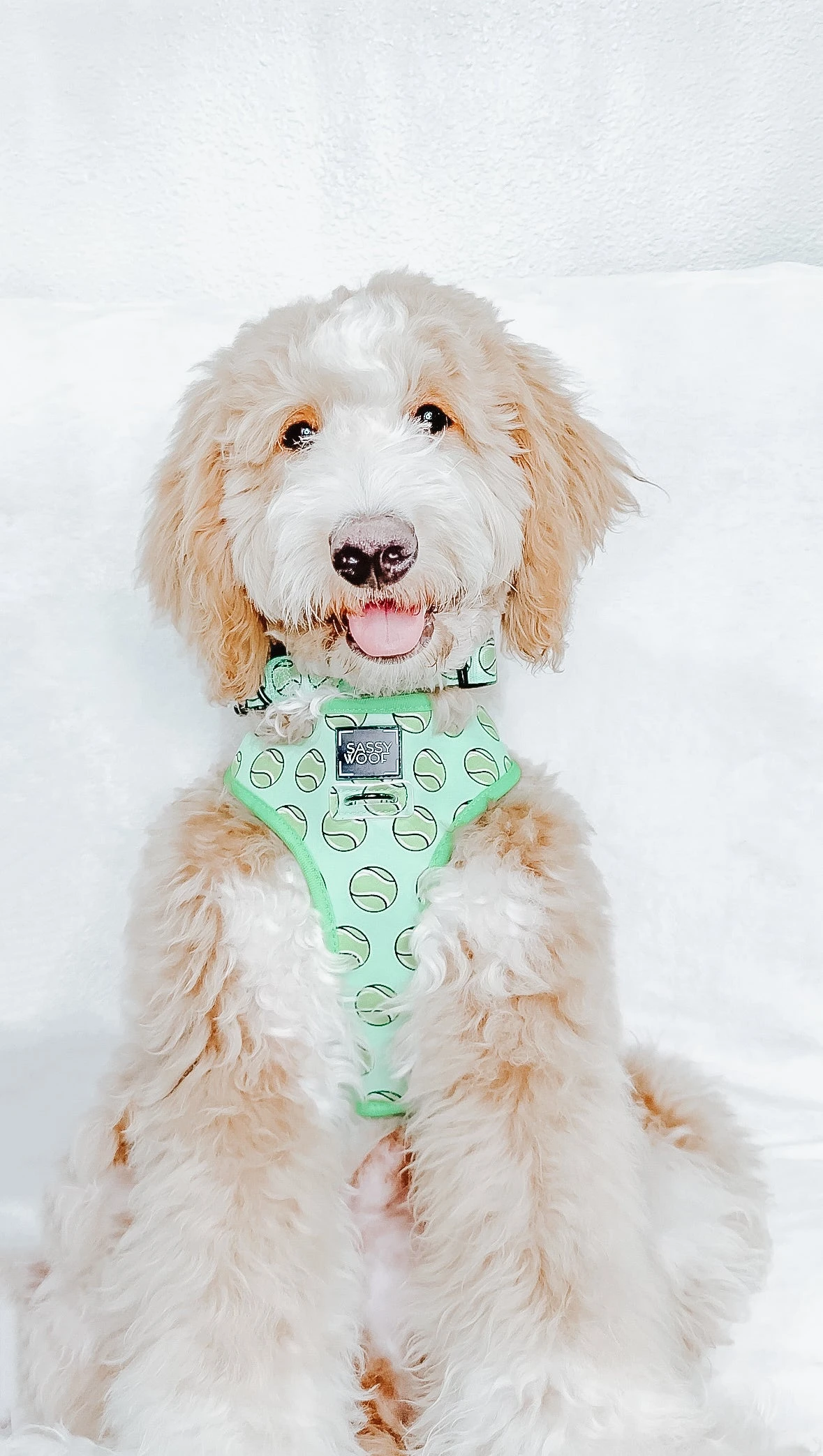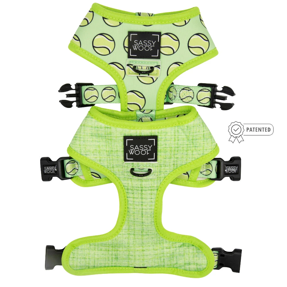 Fetch me if you can! Your pup will be fast as a speedy tennis ball in this gorgeous bright green reversible harness with tennis balls on one side and solid green on the other!Ā