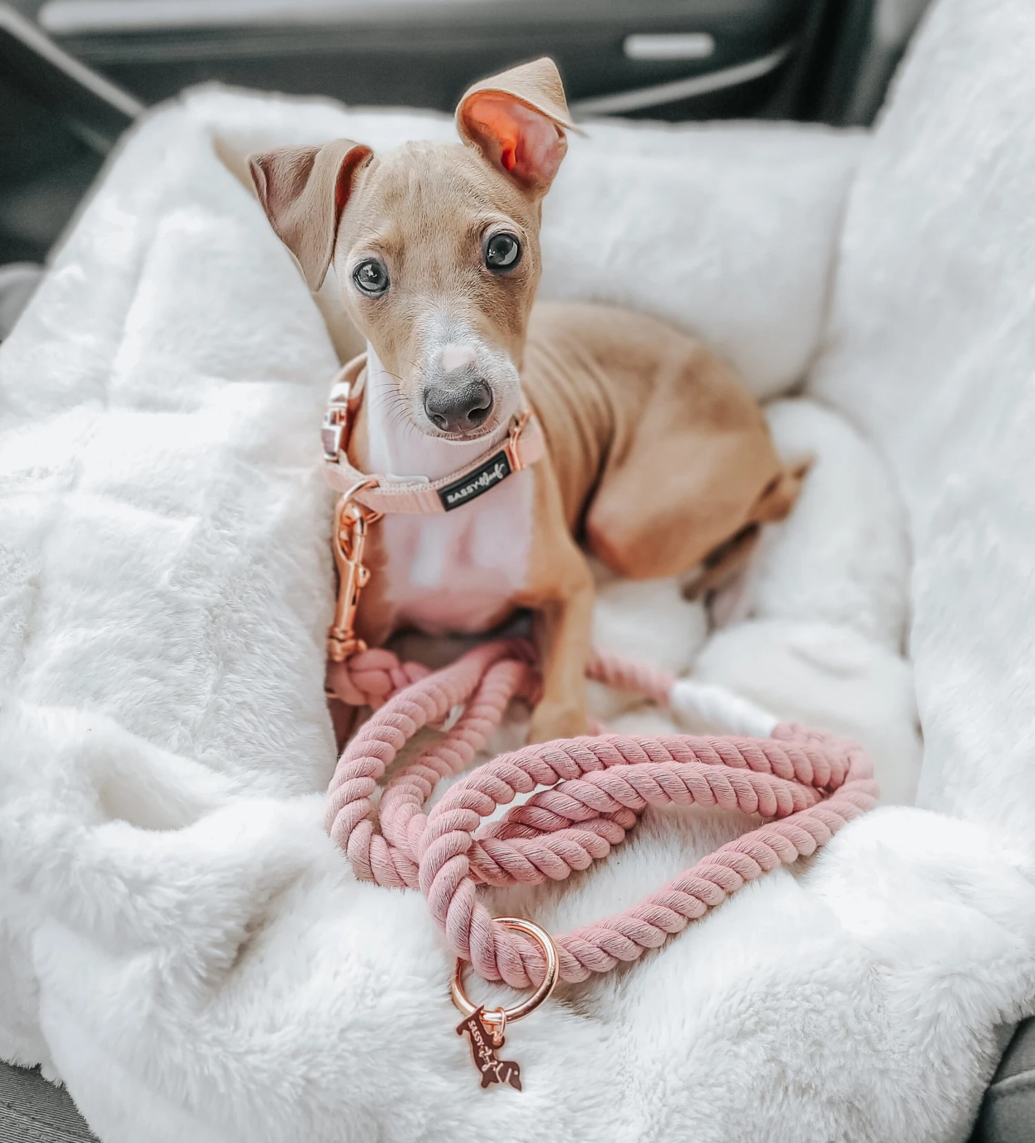 - Beautiful luxe rose gold hardware with a matching rose gold dog charm and accessory ring