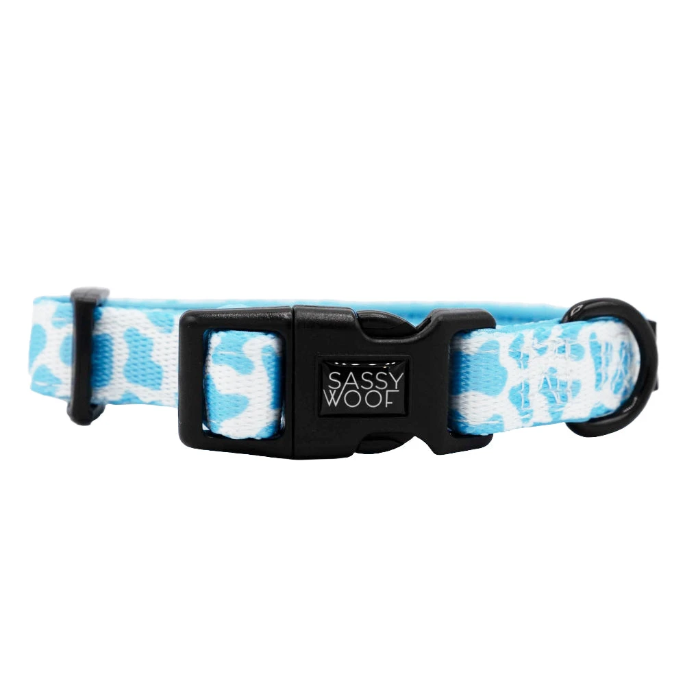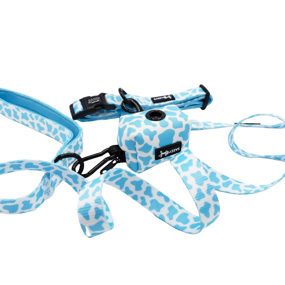 Imagine your pup trotting around in a cow print harness that combines rustic charm with a modern twist, all while being complemented by the serene, soothing tones of light blue reminiscent of fresh blueberry milk.
