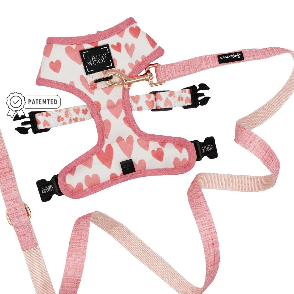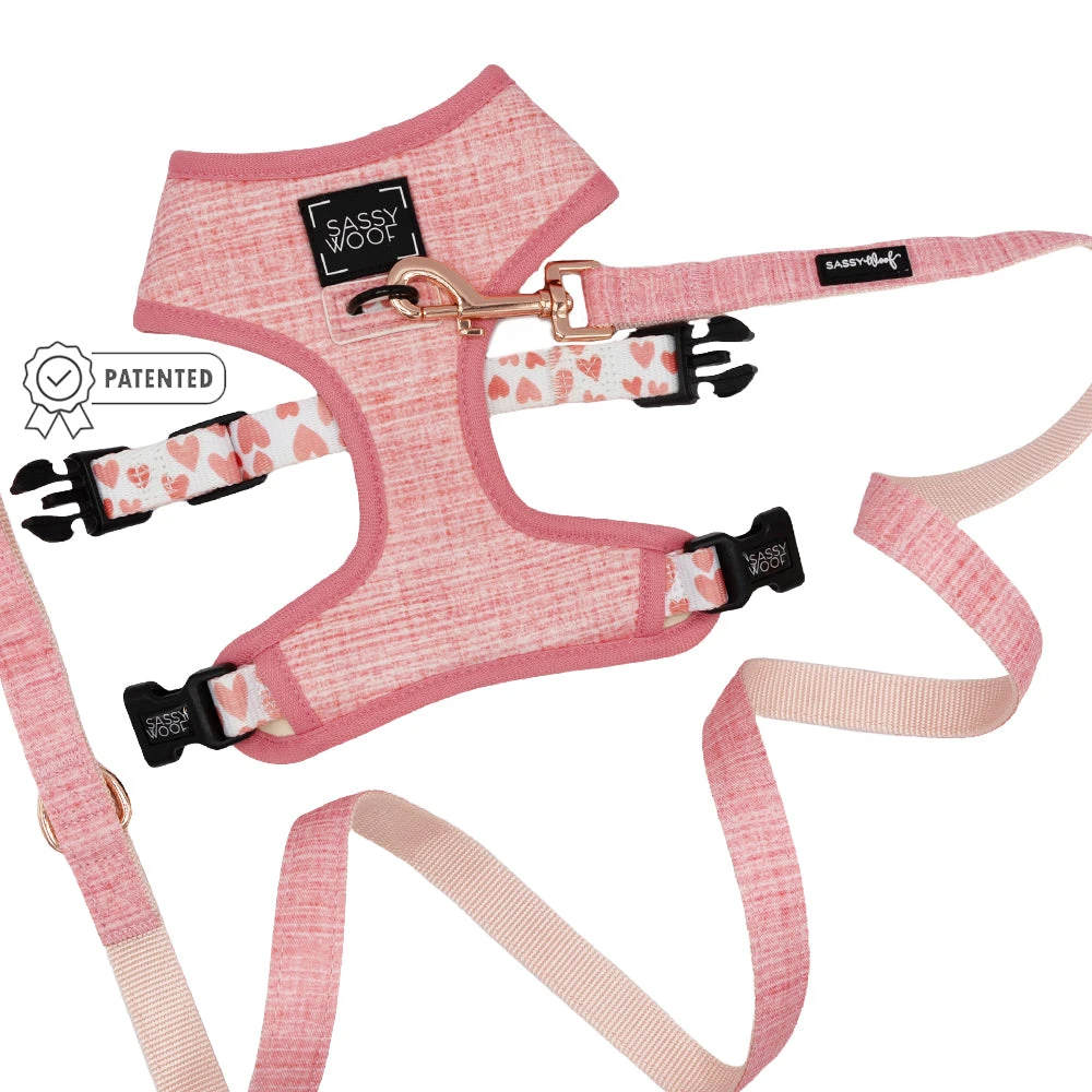 Featuring an original Sassy Woof design, the ‘Dolce Rose’ collection is a staple for every dog’s wardrobe. This reversible harness features a bright pink side for a pop of color. On the other side are adorable hearts for the pup that you love. Two patterns in one makes this harness versatile and fun!