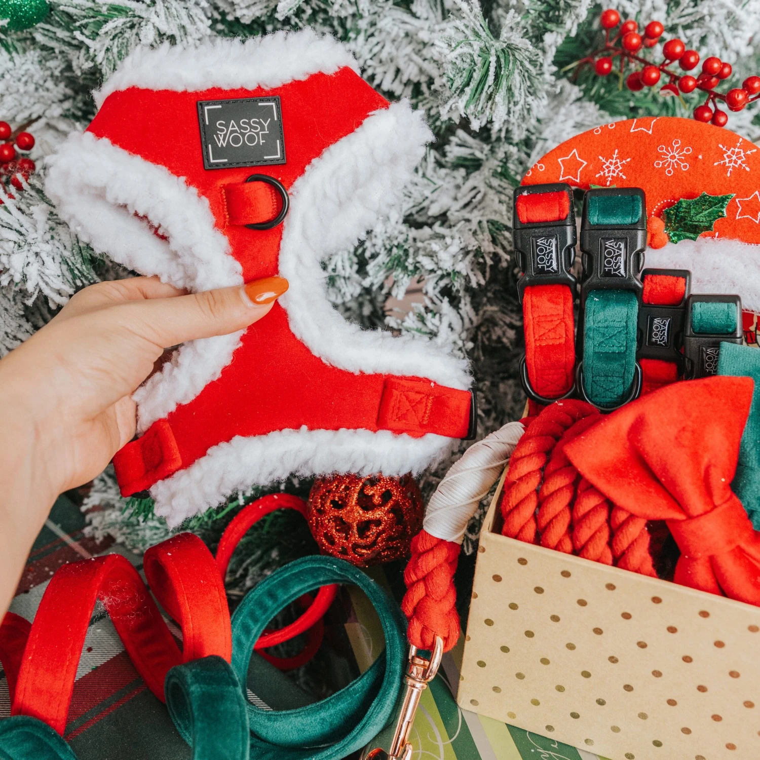 It’s okay if your dog is a little naughty! Celebrate the festive season in luxurious style. Featuring exquisite velvet dog accessories with soft Sherpa trim. Designed to keep your furry friend warm and stylish, this collection adds a touch of holiday magic to every walk and cuddle session.