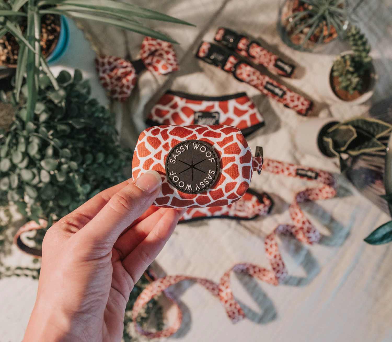 Welcome to Giraffic Park! Peaceful, with their heads in the clouds, this waste bag holder is pawfect for your gentle pup! Feel free to mix in coins, your key, or some extra treats on your walk.