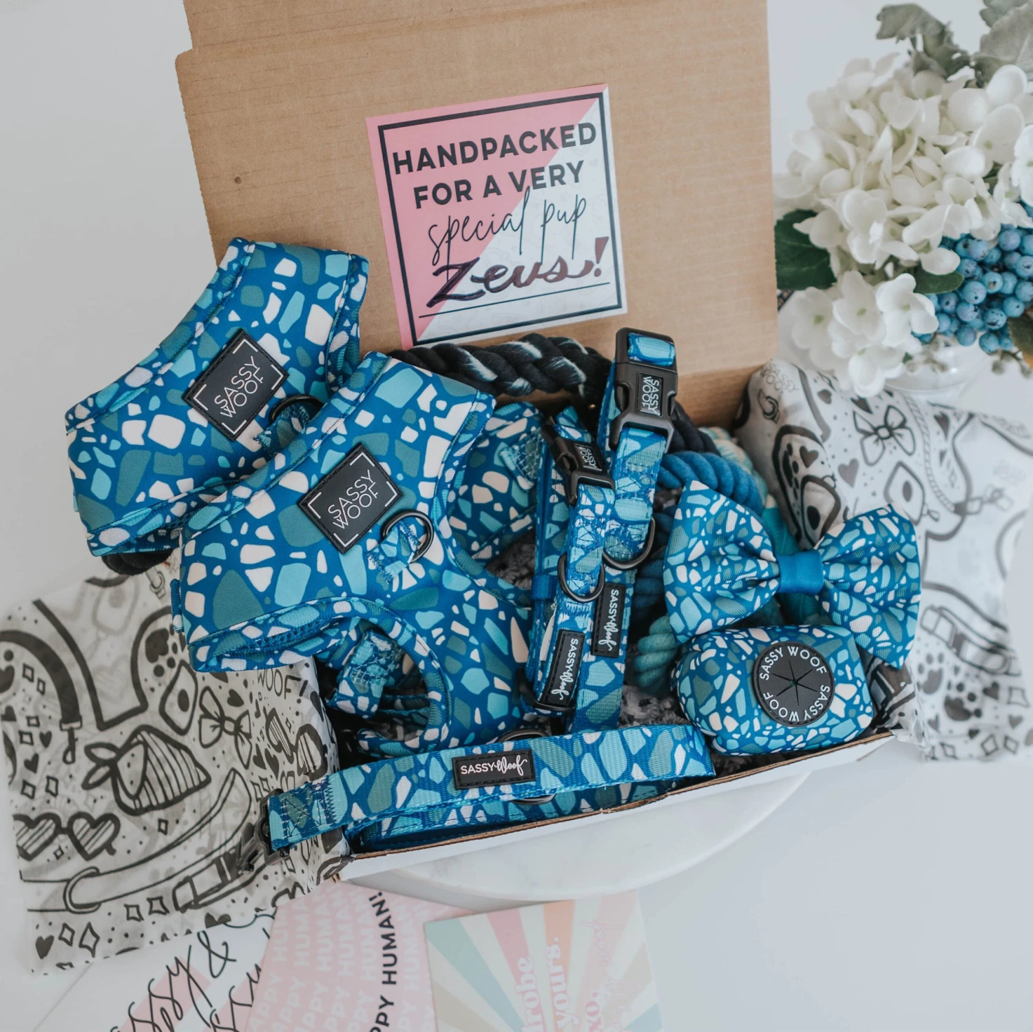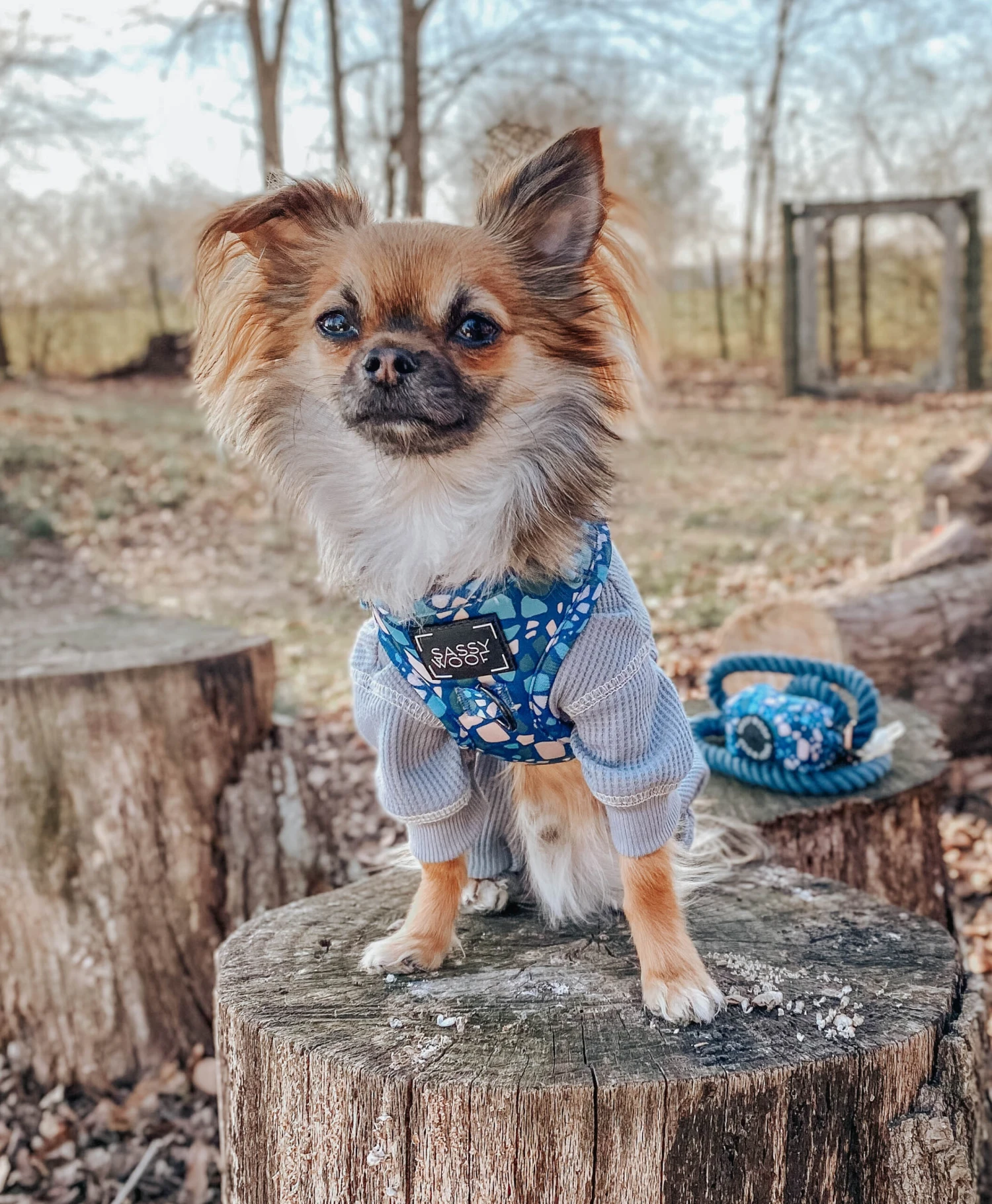 - Complete the set with our matching adjustable harness, leash, collar, and bowtie!